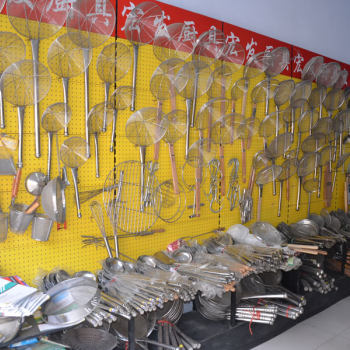 宏发不锈钢制品厂位于山东省临沂市河东区工业园,主要生产经营:18cm-40cm全钢和木柄线漏、18cm-30cm斜纹、粗网油抄、5寸-10寸筛网铁笊篱和各种手编花眼笊篱、34cm-40cm短柄加固不锈钢线漏、不锈钢大铲、肉叉、勺子、各种分样筛子、厨房酒房酒店用品等。